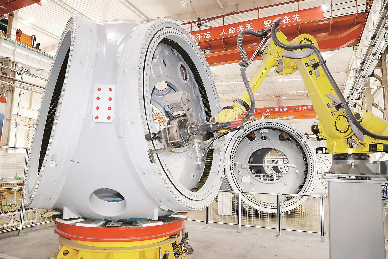 通榆县依托当地风力资本劣势,紧盯出名风电配备制制业企业开展招商引资工做。图为通榆县三一风电配备手艺无限义务公司的从动化出产车间。丁研 摄?。